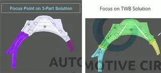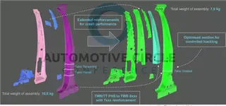 In order to meet the requirements for the safety performance of car bodies, the updated Audi e-tron adopts two hot forming technologies, that is, steel hot forming and aluminum hot forming. The steel hot-formed parts mainly include the front wall, the middle longitudinal beam, the seat mounting beam, and the rear longitudinal beam. Aluminum hot-formed parts mainly include A-pillar inner and outer plates, and B-pillar. The A-pillar assembly uses 7 series of aluminum alloys, the B-pillar outer plate 6 series of laser-welded aluminum alloy plates, and the reinforcement plate 7 series of aluminum alloys. The weight of the B-pillar assembly is reduced by 21%.