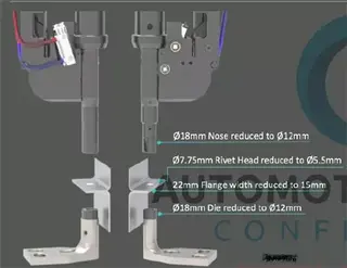The A-pillar adopts small-size rivet riveting technology. The diameter of the rivet is reduced from 5.3 mm to 4 mm, and the overlapping edge is reduced from 22 mm to 15 mm. The application of this technology causes a weight reduction of 40% in the A-pillar area.