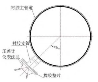 The design material of the plate heat exchanger's inlet pipe is P265GH, and the diameter is 711.2mm; the internal anti-corrosion adopts neoprene rubber with a thickness of 4mm. The material and anti-corrosion design of the branch pipe are the same as those of the inlet pipe, with a diameter of 88.9mm, and the branch pipe and the inlet pipe form an angle of 45. The material of the flange of the differential pressure gauge is Z2CND1712, which is similar to 316L. The flange and the branch pipe are connected by bolts, and the gasket is a rubber gasket. The schematic diagram of the pipeline layout is shown in Figure 1.