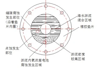 In the early stage of corrosion, a small gap is formed between the deformed rubber gasket and the stainless steel flange, and there is an oxygen concentration difference inside and outside the gap, which leads to crevice corrosion. With the continuous development of corrosion, the accumulation of corrosion products and mud and sand inside and outside the crevice, the expansion of oxygen concentration inside and outside the crevice, the migration of chloride ions and the decrease of pH value lead to the intensification of the corrosion, and finally crevice corrosion with different degrees happens for the stainless steel flange along the edge of the gasket. In the middle and late development stages of corrosion, the density of the silt at the bottom of the flange surface continues to increase due to the sedimentation of silt. The transmission of oxygen in this area is more difficult than that in the mixed area of ​​seawater and silt. There is a certain oxygen concentration difference in the silted area with different densities. The potential of the flange surface is low, and that of the stainless steel flange surface in the low-density mud area is high, forming a potential difference, which further aggravates the crevice corrosion on parts in the high-density mud area, making the corrosion pits expand and deepen. In addition, the CT content in the entire silt area is high, and the CI destroys the passive film on the stainless steel flange surface, thereby causing pitting corrosion on the stainless steel flange surface. As shown in Figure 7.