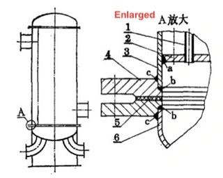 The two-stage cylinder short joint is adopted, and the manufacturing points are as follows: ① The two tube sheets are overlapped and then drilled. ② The short joint of the cylinder body is assembled with the flange, and welding should be performed in the order of a and b. The concave surface of the tube sheet is processed after welding, as shown in Figure 3. ③ Perform spot welding for the tube sheet and the flange, and then put the same two parts back to back; tighten the tube sheet with enough bolts. Put a process plate with appropriate thickness in the middle, so that the welding seam d can be easily welded. As shown in Figure 4, perform welding in the order of c and d. ④ Disassemble and process the sealing surface of the tube sheet. ⑤ Mark and drill flange bolt holes. ⑥ The two circumferential seams of the above short joint parts of the cylinder body and the simplified assembly welding shall be welded after the tube bundle is pierced, and the lining ring structure shall be adopted. Before the circumferential seam is welded, the heat exchange tube can only be welded on the tube sheet at one end, and the other end will be spot welded after the circumferential seam is welded; perform welding.