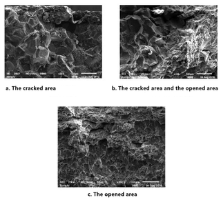 Energy spectrum analysis was performed on the surface of metallographic sample 1 (Table 2). The energy spectrum analysis of the opened SEM specimen (Table 3) shows that the Cl content in the cracked area is 2.14% (weight percent), and with the increase of the tearing depth, the Cl content gradually decreases; in the open area, the Cl content is 0% (weight percent), indicating that Cl- has not played a role in stress corrosion in the uncracked area of the material.