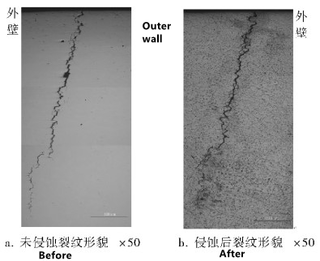 Macroscopic inspection of the leaked flange shows that there was no obvious corrosion product after the outer wall of the flange is treated with anti-corrosion. The morphology detected by PT is shown in Figure 1. There were two stepped cracks with lengths of 34mm and 12mm along the circumferential direction of the flange neck. The cracks were close to the welding seam on the flange side. The sample is shown in Figure 1.