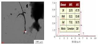After the cross-section of the sample was polished, it was scanned by a QUANTA400 electron microscope. Only Si, Mn, and O elements were found on the metal substrate at the extension of the micro-cracks around the warped skin interlayer, and no continuous casting mold slag components such as Ca, Mg, and Na were found (Figure 3). The main component of the warped skin interlayer is the oxide of iron, which is ferrous oxide (Figure 4). Electron microscope analysis did not find abnormal components such as mold slags, and the outer skin of the seamless steel pipe caused by slag inclusions on the surface of the tube blank is ruled out.