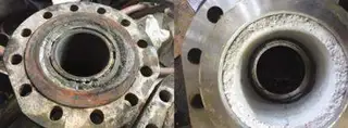 3) The flange lining sleeve was parallel to the sealing surface. When the fire-resistant gasket was originally installed, the external flange could not play a sealing role. The bolts could not press the external sealing surface due to the great thickness of the fire-resistant gasket, resulting in the leakage of the flange. In this overhaul, the flange lining sleeve of the reducer was reduced by 5 mm, so that the fire-resistant gasket could properly seal (Figure 3).