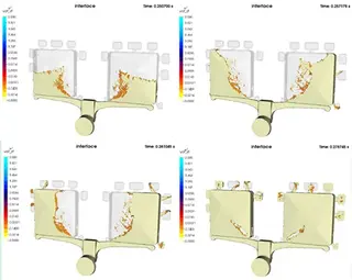 The numerical simulation results of the filling process of scheme 2 are shown in Figure 4. It can be seen that since the cross gate is located in the middle of the two cavities, and the inner gate is set on the inner side of the cavity, it gradually fills the inside first and then the two sides after the molten aluminum alloy enters the cavity; the molten aluminum alloy flows smoothly. There is no turbulent flow, and the filling process conforms to the filling theory of full wall thickness. The last filled part of the molten aluminum alloy is the outermost at both ends of the cavities, and an overflow groove is set at this part, so that the front-end molten cold-stained alloy can enter the overflow groove, thereby, effectively avoiding the formation of entrained air, slag inclusions and other defects inside the casting.