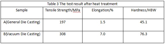 Common die casting samples and vacuum die casting samples are divided into two parts, T6 heat treatment is applied to one part of each sample, the other part of each sample doesn't be disposed. Then, test their mechanical properties. Tensile tests were carried out in the CSS-1120 type electronic universal testing machine, hardness testing in HB-3000 Brinell hardness, head diameter of 5mm, the load value is 2.452KN, maintain the load time of 30s, the environment temperature is 18 ℃.