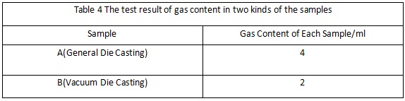 Table 4 shows the two test results of die casting process of die casting gas content It can be seen from table 4 that the gas content of the vacuum pressure casting is really less than that of the ordinary pressure casting.