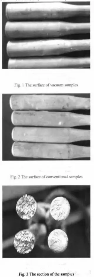 Fig.3 section photos of two specimens after tensile strength test. The left side of the figure is the section of the common die casting sample, the right side is the section of the vacuum die casting specimen. It can be seen from the figure that the section of the common die casting specimen is rough, the color is dark, the section of the vacuum die casting sample is close, and the color is more close to the color of the aluminum alloy. After Measure the diameter of the same parts of the sample, compared with the heat treatment, it is found that the diameter of the ordinary die casting samples increased by more than 0,1mm, while the vacuum die casting samples have almost no change.