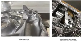 After machining, a leak test was carried out, and it was found that there was a leak between the two oil passage holes. The product's qualification rate was 20%. The product was sectioned and it was found that the large shrinkage cavity between the oil passages was the main cause of the leakage. The sectioned picture is shown in Figure 2.