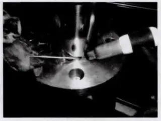 e. Spot welding at position e (Figure 4): place the flange of the weldment downwards on the rotating platform, and perform spot welding at the welding part by hand. The degree of melting shall not affect the final complete welding. The diameter of the welding beam should exceed the width of the welding seam after forming.
