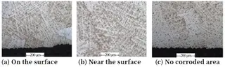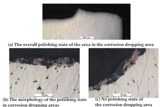 Figure 3(a) shows the metallographic structure of the overall polished state of the cross-section of the corrosion drop area. It can be seen from the figure that a large number of point-like particles are dispersed and distributed on the matrix of the valve disc, and no metallurgical defects such as microscopic porosity are found in the entire matrix morphology. The corrosion drop area in Figure 3(a) is magnified and observed. The entire area is covered with corrosion products, and decomposition areas coexist with corrosion products. The morphology is shown in Fig 3(b). The magnified observation of the non-corroded part also found that there was a corrosion product, and there was a red area caused by de-composition corrosion partially. However, it can be seen that compared with the part where corrosion and falling occur, the decompositing in this area is relatively small, and the specific morphology is shown in Figure 3(c).