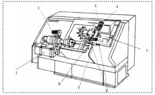 1. Spindle motors 2. Spindle speed sensors 3. X-axis feed servo systems 4. X-axis resolvers 5. Display and operating systems 6. Ball screws 7. Z-axis feed servo systems 8. X-axis resolver diagrams