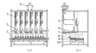 1- rack; 2- Filling head; 3- Lifting device of filling head; 4- Separating tank; 5- Metal hose; 6- Material receiving box; 7- Servo transverse barrel pushing device; 8- Empty barrel conveying line; 9- Weighing device; 10- heavy barrel outlet line