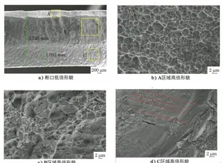 Samples were taken from the fracture of the valve tube, and the fracture was fully cleaned with ultrasonic waves, and then observed with a scanning electron microscope (SEM), as shown in Figure 3. The fracture is divided into areas A, B, and C. The area A is close to the outer wall of the valve tube, and the shear lip feature can be seen. The area B is the fresh fracture surface, and the area C is the welding defect region. After measurement, the width of the fracture is about 2.75mm, and the width of the C area is about 1.08mm, which is about 39% of the total width.