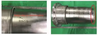 One end of the check valve is connected to a cover plate by a flange, and the fracture is on the other end of the valve tube, as shown in Figure 1. It can be seen that the outer wall of the valve tube is deformed due to being squeezed by the gas in the valve tube. In order to measure the deformation degree of the outer wall of the valve tube, starting from the flange end, select 6 measurement points from A to F with a gradient of 5cm, and measure the outer circumference at each point, as shown in Figure 1b. The test results are in Table 1. It can be seen from Table 1 that the outer diameter of the valve tube decreases one by one from the flange end to the fracture.