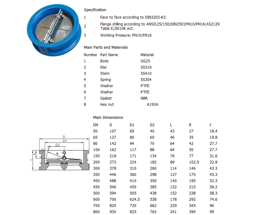 Wafer Dual Disc Check Valve, Cast Iron GG25 or Ductile Iron GGG40 Materials, DIN3202-K3, Working Pressure: PN10, PN16, Disc: Stainless Steel 304 or 316, Size: DN50-DN800