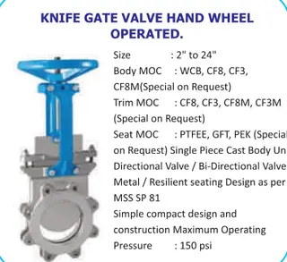 Knife Gate Valve Hand-wheel Operated Size: 2" -24", Body Materials: WCB, CF8, CF8M Carbon Steel, Stainless Steel, Seat Materials: PTFE, GFT, PEK, Single Piece Cast Body Uni Direction Valve/Bi-Direction Valve Metal, Resilient Seating Design as per MSS-SP 81 Standard, Simple Compact Design and Construction Maximum Operating