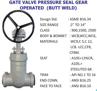 Gate Valve, ASME B16.34, Body and Bonnet: ASTM A217 WC6, ASTM A217 WC9, Pressure Seal, Gear Operated, Butt Welded, Size Range: 2 -14 Inch, DN50-DN350, High pressure: 900#, 1500#, 2500#, Metal Seat, Connection Ends: ANSI B16.25, Face to Face: ANSI B16.10