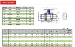 Components: EPDM, VITON O-Ring; PPH, PVDF Flat Socket; PPH, PVDF Nuts; ABS Shipping Mark; PPH, PVDF Stem; ABS Handle; PPH, PVDF Lining; PTFE Seal; PPH, PVDF Ball; PPH, PVDF Valve Body