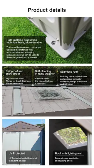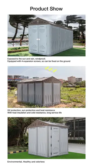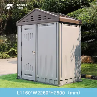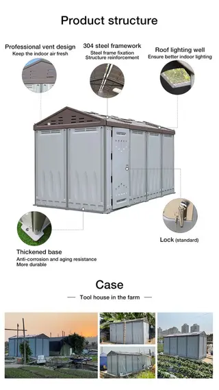 The maintenance-free garden storage house combines the modular structure technology and the durability of resin. This shed provides a perfect storage solution for the garden and roof. Optional parts: Lock, single door and double door, adjustable shelving and storage system, hook and other daily necessities. Optional facilities: Air conditioner, lamp, portable toilet, hand washing station, mop basin, etc.
