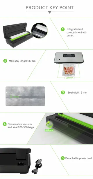 Vacuum Sealer Provider: Built-in Roll Vacuum Sealer with Bag Cutter, 160W (ETL), 130W (EU), Stainless Steel Cover, Easy Lock & Unlock, Seal length 300mm.